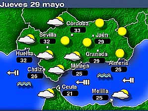 En el informativo de ayer noche pudimos ver las temperaturas que se dieron en las capitales de provincia andaluzas y las ciudades españolas del norte de África. |